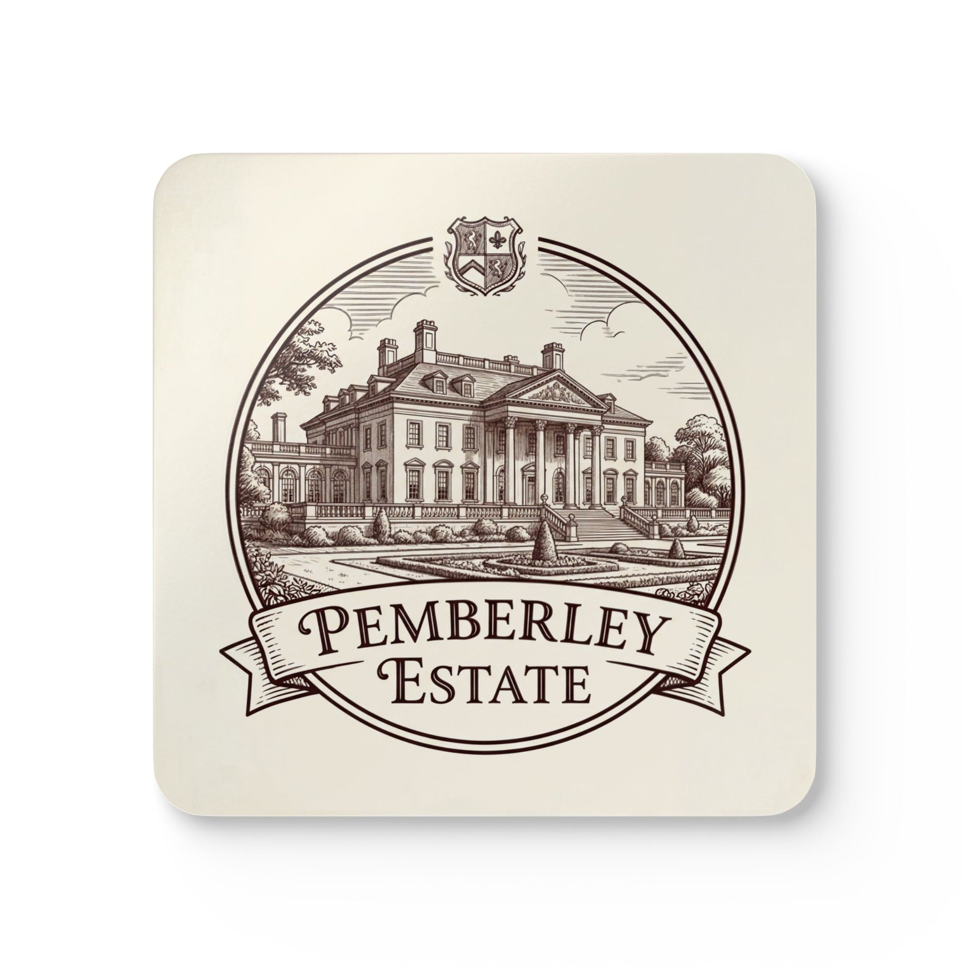 Bring a quiet touch of the estate to your tabletop. This set of four cork-backed coasters features the Official Pemberley Estate logo—a refined architectural illustration with classic lettering that feels archival, elegant, and unmistakably “Pemberley.”